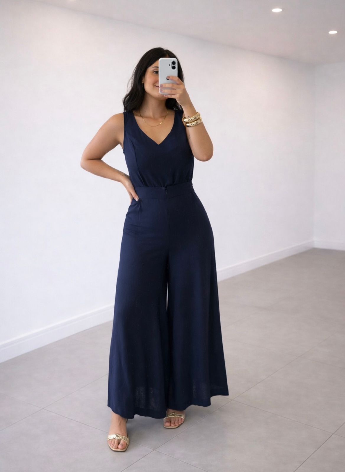 Blusa — Com decote V e modelagem pensada para harmonizar perfeitamente com a calça, com caimento solto e comprimento ideal para tuckar ou usar por fora.